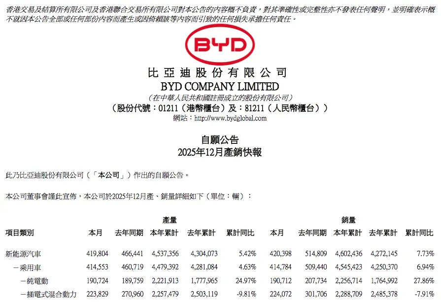 一是,去年下半年以来新能源汽车市场增速已经肉眼可见的下行,预计今年国内新能源市场增速放缓至10%左右,补贴政策力度减弱。二是,2025年9月至12月,比亚迪连续四个月出现销量同比下滑,其中12月的销量环比下滑12.45%,同比下滑18%左右,为两年来最大单月降幅。
