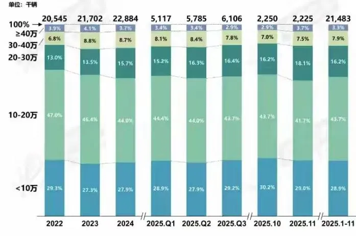 值得注意的是,2024年国内乘用车平均售价为18.4万元,到2025年前11个月已降至17.8万元。单车成本的下行,侧面反映出部分车企仍在采取以价换量的市场策略。但鉴于利润诉求将成为明年多数厂商的核心考量,预计不少车企会继续稳固10万20万级车型的走量优势,同时将竞争焦点向20万以上价位段。
