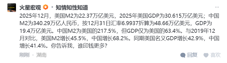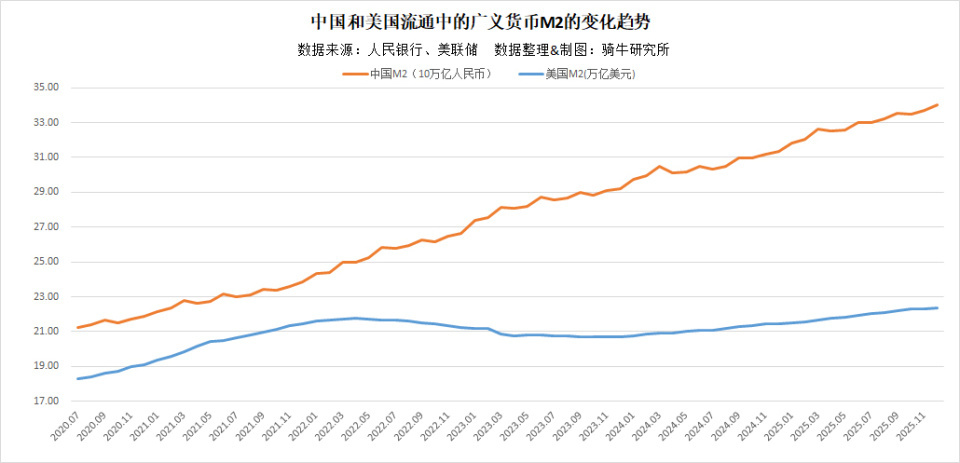 2025年12月,美国M2为22.37万亿美元,2025年美国GDP为30.615万亿美元;中国M2为340.29万亿元人民币,按12月31日汇率6.9937折算为48.66万亿美元,GDP为19.4万亿美元。中国M2为美国的217.5%,但GDP仅为美国的63.4%。与2019年12月对比,美国M2增长45.5%,中国增长68.2%。同期美国名义GDP增长42.9%,中国增长41.4%。