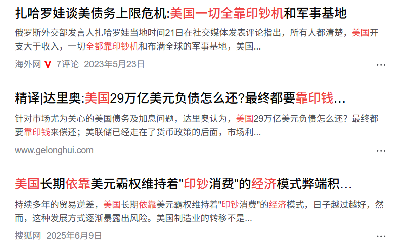 一些媒体和专业机构也喜欢传播这样耸人听闻的、有利于收获流量的观点。比如《海外网》就借扎哈罗娃之口说,“所有人都清楚,美国开支大于收入,一切全都靠印钞机和布满全球的军事基地”。