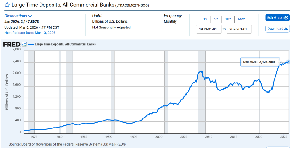 根据美联储公布的数据,2025年12月美国大于10万美元的所有商业银行的大额存款为24252亿美元,加上这一数据,美国2025年M2的规模也只有24.8万亿美元,只有我们M2规模的一半(51%)。但美国的GDP是我们的1.58倍(157.8%)。
