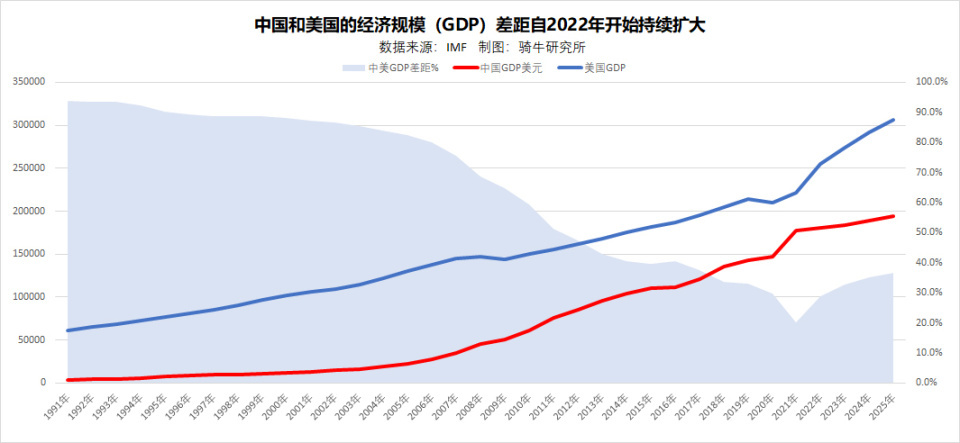 2008年,美国金融危机爆发进入经济调整周期,2009-2018年这10年美国的名义GDP年均增长3.37%,同期中国名义GDP年均增长高达11.02%。但此后,美国在新一轮科技创新推动下进入新一轮经济繁荣周期,2019-2025年名义GDP年均增长5.9%,同期中国因房地产泡沫破灭以及家庭与企业债务负担触顶而进入调整期,名义GDP增速大幅回落至5.2%,最近三年仅4.2%。