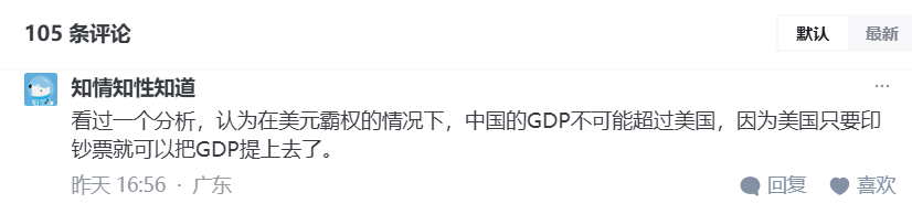 但有一些缺乏经济学常识的网友抬杠说,看过一个分析,认为在美元霸权的情况下,中国的GDP不可能超过美国,因为美国只要印钞票就可以把GDP提上去了。