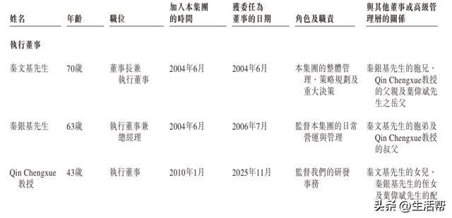 在董事会人员介绍中,董事长秦文基今年70岁;总经理秦银基今年63岁,是秦文基的胞弟;执行董事Qin Chengxue,是秦文基的女儿,配偶为叶伟斌;叶伟斌现任公司秘书。