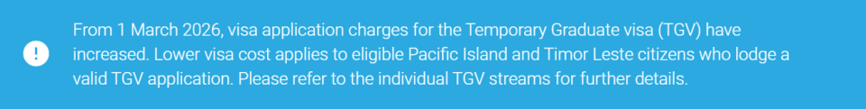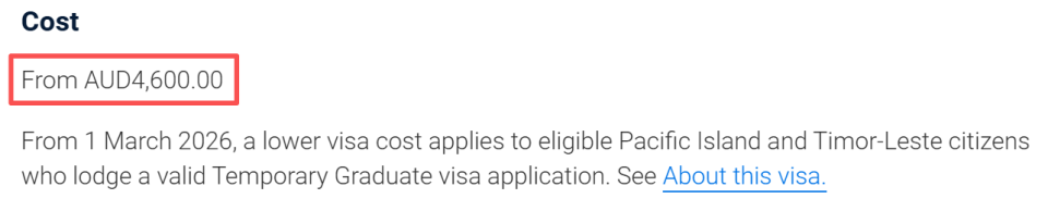 澳大利亚政府近日宣布了一项关于485毕业生工签的重大政策调整。从2026年3月1日开始,这一签证的申请费将从目前的2300澳元直接翻倍至4600澳元,续签费用也同步涨至1810澳元。这是该签证类别有史以来最大幅度的一次费用上调,且没有提前预告,所有3月1日之后递交的申请都将受到影响。