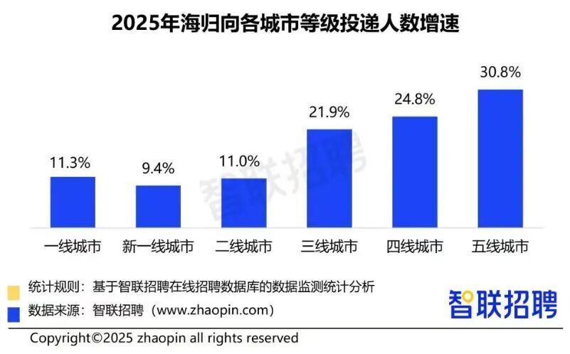城市分布方面,一线和新一线城市凭借资源优势仍吸引近八成投递,但下沉市场悄然崛起,三四五线城市投递增速均超20%,远超一线。可见,在政策与产业双重驱动下,海归就业路径日趋多元,无论是专业方向还是地域选择,都能找到适配自身发展的赛道。